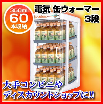 電気ペットウォーマーPW60-N3仕様 ●段数:3段 ●電源:単相100V ●消費電力:450W ●蛍光灯:無し ●缶設定温度:55±4℃(外気温度20℃の時) ●加熱方式:ホットプレート方式 ●温度制御:各段自動独立方式 ●安全装置:過熱防止機能 ●加温時間:約2時間32分 ●扉:前後面ドア式 ●外形寸法:335mm×425mm×704mm(W×D×H) ●重量:17kg ●付属品:整列レール・転倒防止バーコンビニや薬屋さんによく置いてある、缶ウォーマーやペットウォーマーを紹介しているページです。